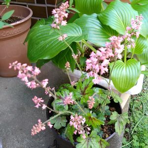 ヒマラヤユキノシタ 去年今年と咲かなかった、、、 株分けして植替、用土も鹿沼土と腐葉土で置き場所も変えて1年後に期待します。 咲いてるのはヒューケラ·ピンクレボリューションです。