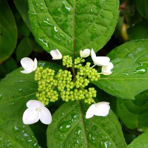 ヤマアジサイ全開 白と薄紫色の花弁が清げなヤマアジサイ。葉も小さく可憐です。