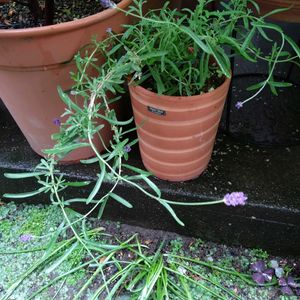 イングリッシュラベンダー 3年目ほふくしながらも開花。 日あたり、風、土、雨、水やり、剪定をいろいろ悩みながら育てるもまっすぐいかず徒長しながら咲いてます。