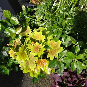 春の寄せ植えの花後 モミジバゼラニウム、ガザニア、チェッカーベリー、ジュリアン、テイカカズラ、ワイヤープランツ、オリヅルラン チェッカーベリーに蕾がついてきました。 モミジバゼラニウムは花芽があり、まだまだ咲きそうです。 それぞれ葉っぱのかたちを楽しみます。
