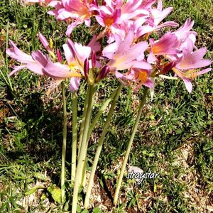 こんにちは☺️ ヒガンバナ科のリコリス見つけました💖 草叢にピンク色を見つけて 近づいてみれば、盛りを過ぎたリコリスが一本咲いていました😅 もう少し早く見つけたかった❣️ 台風の影響でしょうが、時々強い雨☔️ 時々強い陽射しの中で咲いています😊