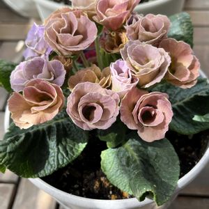 こんにちは✨快晴です☀️昼過ぎて気温17℃で暖かいです😊 1️⃣プリムラポリアンサ・コロネット🎀 アンティークな色合いが🎵お気に入りです🥰 2️⃣カネコ種苗のフリル咲きパンジークラッピング✨花がボリュームあって可愛いです🎶 3️⃣見元園芸つぶらなタヌキ✨青空に向かって背伸びしてるみたい😆