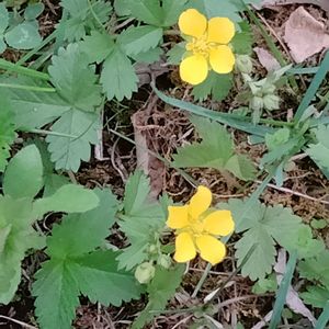 山梨県南東部自宅の庭で見つけました。黄色の花の直径は約2センチほどの小さい物です。庭の一部に群生しています。名前を教えていただければ幸いです。(大きさ比較の為軍手の指先一部を画像に入れてあります。) よろしくお願い致します。 追伸ーその後2名の会員さんからヘビイチゴのご回答をいただいたので、確定させていただきます。 ご協力ありがとうございました。感謝です。
