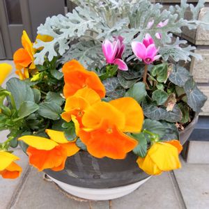 おはようございます(◍•ᴗ•◍)✧ ෆ去年年末 葉牡丹と寄せ植 えした鉢花 葉牡丹は⭐に 春を迎えました 💛パンジー 🤍シロタエギク ❤️シクラメンと仲良く 元気に咲かせて🤗 🍀良い一日をお迎え 下さい☺️
