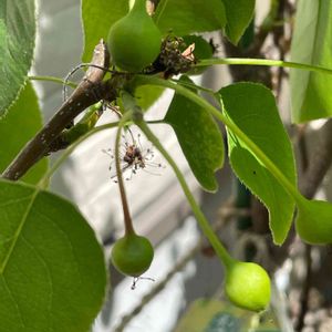 豊水 3年目の梨の木。 背丈ほど伸びた木に満開の花が咲き、実が1つ成りました。 無事に成長するのでしょうか?😅