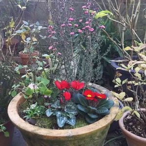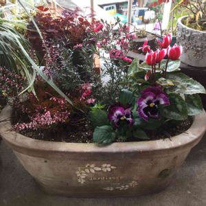 秋から冬のギャザリングの鉢植え 寒くなってきたら、シクラメンやビオラが元気になってきました