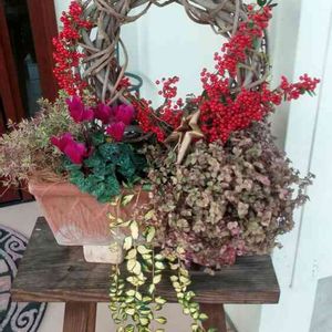 今日のお花、クローバーをいれた寄せ植え😊 (シクラメン、クローバー、アジュガ、初雪カズラ) ロハスで作ったリースも色付いてきたかな⁉️ 虹の玉がもっと紅葉🍁してくれるのを待ってます🙏