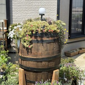 力もちの子供から手伝ってもらって オイスターバーから譲って頂いた ワイン樽を畑に移動🍷 相当デカいし、すっごく重たい。 3人でやっと持った😖💦💦 パーゴラとも、パラソルとも しっくり合って😊素敵になったよ 樽の後ろのシュガーホワイトが 全く隠れてしまったが……💦 また、咲いてから考えよう😊💖 お天気がいいので☀️🌈 ガーデニング日和