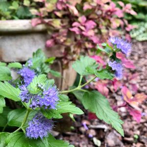 去年お迎えして地植えしたカリオプテリス ヒントオブゴールドが咲きました🌸 でもちょっと日陰過ぎたのか、 お日さま目指して横に寝てしまい、段に咲いているのがあまり感じられないという〜😵💦 後ろの鉢植えのキャツラもいい味出してくれてます🍁