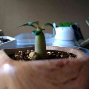 オベスム2体、少しだけ葉が出ている。 塊根部分が痩せてきているから水やりを開始したくなるけどまだ我慢。 壁|ω•`๑) 。oO(それにしてもまだまだ幼いサイズだなぁ)