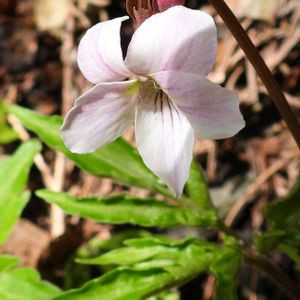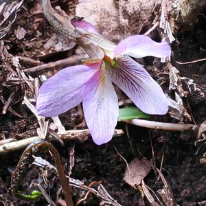 高尾山に春一番の薄紫色アオイスミレの花が咲き始めました💜🌿 葉はハート形(アオイの葉形) 萼片は丸く太目、距はプックリ上に上がっています。 花柱の先はカギ状に下に曲がっています。 スミレ科 スミレ属