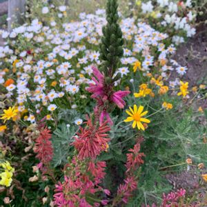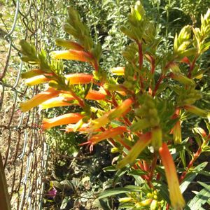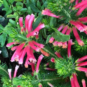 松のような葉と赤い筒の花