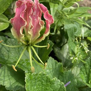 今朝の水やりの時に気づいたお花たち🌸 ①② ユリ目イヌサフラン科 「グロリオサ」 3年前から植えっぱなしでした ③ オステオスペルマム又咲き出しました ④ツマグロヒョウモンが休憩中でした♪🦋