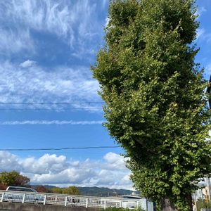 今日の空は、青かった😻 今日のイチョウは、まだあおかった😿 西国街道 芥川橋東にて🤳 かつてはこんな樹形ではなかったようで😌