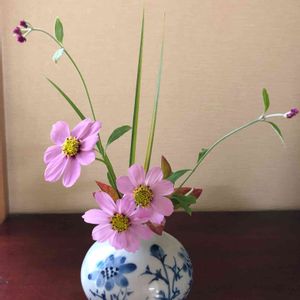 最後のコスモスと🌸 紅葉した千日小坊を🍁 コスモスの花瓶に生けました🌿