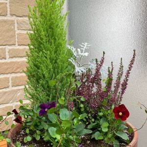 大人買いしてきたビオラとゴールドクレストを植えてみました🌱 夏野菜と朝顔から冬らしくイメチェン🪴 やってみたかったプリムラジュリアンを探したけど、まだ少し早いみたいで数が足りてないです😅 そして、寄せ植えセンスはイマイチのようです🥲 空のポットで場所はとってあるから、見付けたら植えよう😆