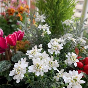 西日本が冷え込むって予報やったのに、 大阪市は風が強い日が続いたくらいで、 特に冷え込んでないけどー? 写真は手前からハツユキカズラ、アリッサム(紫)、 アリッサム(白)、バコパ(白)。 左手に写るゴールドクレスト ウィルマを 隣家からの目隠しに並べて植えていて、 普段、室内側から花は見えません。 だけど覗き込んで見える、この感じが好きです😏