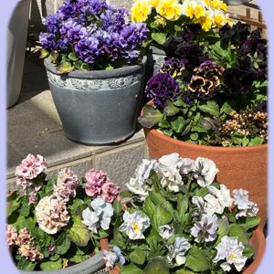 昨日の雪❄️からのお天気☀️ 玄関周りのお花達が先週辺りからもりもりしてくれてご機嫌です😊 手前の右側の鉢は先日旦那氏に倒されて割れてしまい💦奥のやつと大きさ違いのお揃いだったのに⤵️まぁバーゲン品で嘘みたいなお値段だったから諦め🤭綺麗に3つに割れたので太めの輪ゴムで抑えての応急処置🤣🤣咲き終わるまで頑張っておくれ〜(๑ت๑)ノ