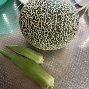 こんばんは😊 🍈メロン、、実がなり、 スジスジまで入り 見守ってきましたが これ以上は大きくならない予感😂 収穫です☺️ オクラは毎日採れて助かる〜😃🎶