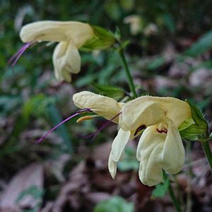 黄花秋桐 シソ科 アキギリ属 多年草 花期 8〜10月 分布 本州〜九州 一対の雄蕊の下部に紫色の仮雄蕊が一対つき先端が合着している。 花筒に潜り込んだ昆虫の背に雄蕊の花粉をつける構造になっている。
