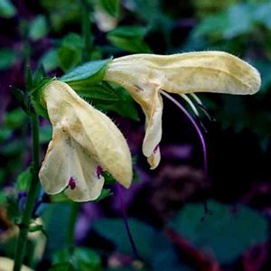 キバナアキギリ(黄花秋桐) シソ科アキギリ属 マルハナバチが蜜を求めてもぐり込もうとすると、不稔性の葯が奥に押され、それによってシーソーのもう一方である花粉の付いた雄しべが下がるという仕組みらしいです❇️😍❇️ 2019/10/12 大分県 籾山神社