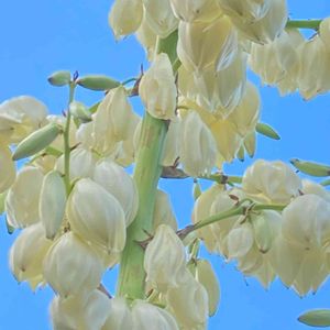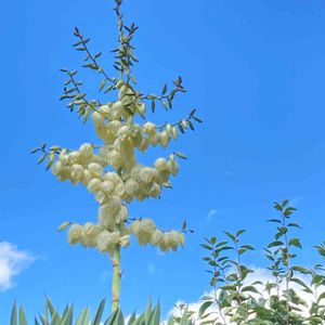 ユッカ(青年の木) 白い花が青い空に向かって咲いています 4〜5mはある大木で花を拡大して写したくてもこれがやっとでした😆
