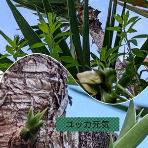 おはようございます。 久しぶりにユッカ。隣の木は柿の木です。 ユッカと柿の間の空の白いポッチは 真っ白なな飛行機です。 ✈️👍👍💕🤳