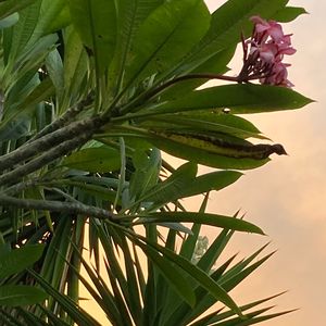 雨が止んだのでウォーキングに出発❗️初めて通った路地の高ーいところにプルメリア❤️ お隣の木はユッカかな? 最近大きなプルメリアの木にバッタリ出会えることが多くてウレシイ😍 木が高すぎて間近でお花が見れないけど、ワイルド感たっぷりです🌲🌸