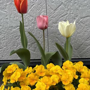 ついに、お三方しっかりと開花しましたー。🌷 ビタミンカラーのビオラさんもモリモリになってきましたー