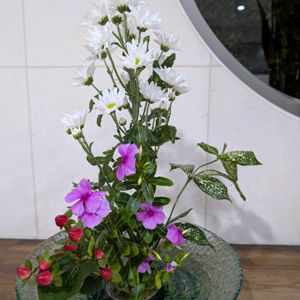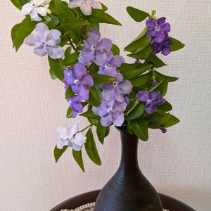 😄〜〜わ静岡市は先月10日、11日の☔以来22日ぶりに午後からパラッと本格的は夜からでしようか🤔 ☔不足の為、適当に降っておくれ〜🗣️ 前回投稿分と一緒に 活けた2作品 花壇のニオイバンマツリ、🦜のおかげでムラサキシキブ今年は 活ける事が出来ました 🤩💞 合計4作品サンスベリア、ポトス、アロマティカス、エントランスのカウンターは、華やか🤩🥳🪴🪴🪴🪴🪴🪴 No1…ニオイバンマツリ エノコログサ エレベーター横飾棚 🌿 備前焼 🌿 エノコログサの大きめ で💚もこれが最後かな🤔〜と思ったら 沢山使用しちゃいました。満足😊😁 この敷物は前回ご紹介岐阜名産羊羹の包みを使用 No2…ムラサキシキブ ニオイバンマツリ 🌿 焼酎の空瓶 🌿 春、夏には🩵涼しげなので重宝してます それにお花の本数も少しで済むし〜🤭 No3…ムラサキシキブ 🤔🤔植えていないのに🟣🌿🟣🌿🟣🌿 🦜からの🎁にしておこう 3年目で1m位に No4…ニオイバンマツリ 5年目位かなやっと こちらも1m位に。まだ花数が少ないので、沢山の切り花には、不可 No5…ポトスも丸2年 なので、春に1番太い茎だけを更新に残し、植え替えます。 来年で36年目に😱🤩 樹里🤗 🟣🌿🟣🌿💜🌿💜🌿🟣🌿💜🌿
