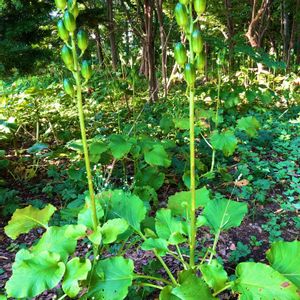 ⬅️こもれびを浴びてエメラルドグリーン。 葉っぱ、つぼみ、花、実、カラカラに乾燥したさく果。 最初から最後迄楽しませてくれるウバユリさん。 花言葉は「威厳」 ぴったりです👌