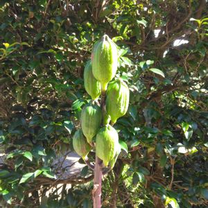 姥百合 (ウバユリ) ユリ科 真っ直ぐに伸びた茎の先に 艶のある熱帯の果実っぽい緑の実が付いています。 お花のときよりも草丈が伸びていて ちょうど目の高さに近いせいか目立つ存在です。 一つ一つが芽キャベツのようにも見えます。 季節が進めば もっと味わいのある姿を見せてくれるでしょう。