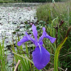 アヤメ類の花が咲く時期は5月〜6月です。 夏の終わりに、蓮池のほとりに、ほんのわずか、美しい立ち姿で咲いています。 アヤメ類にも、いろんな種類があり、見ただけでは判断が出来ません。 図鑑で調べると、花びらの中央に、真白な剣型の模様があるのは、カキツバタでした。 夏の終わりに咲いているのは、珍しいですね💜