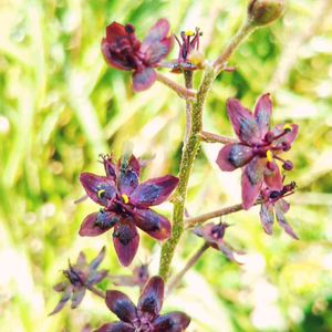 えっ、 山野草⁉️ 草原の山道で、シックな花に出逢いました。 *シュロソウ* 淡い色、目立つ色と、いろんな色合いの山野草の中でとても珍しい色、暗紫褐色の花です。 花びらの中央がキラキラと輝いて、秋色のとてもオシャレな花でした。