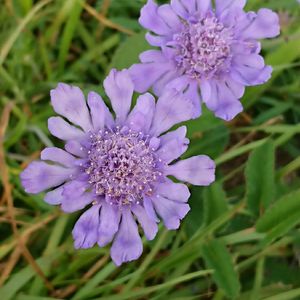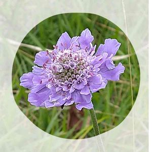* マツムシソウ * 高原のお花畑を彩る、爽やかな花。 昆虫のマツムシが鳴く頃に咲くので、この名がつけられています。 径5センチ位、中央に小花が集まって大きな頭状花を形づくり、外側の花弁が大きく広がる花形と、青紫色のソフトな色合いが、とても魅力的です。 風に揺れて、群れて咲く様子には、秋の風情が感じられます(^-^)