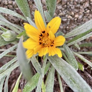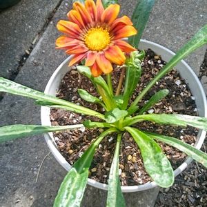 玄関に置いた鉢からのこぼれ種でコンクリートの隙間に生えたガザニア。2年ぶりに咲きました。