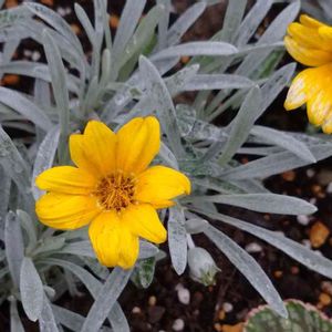 今日のお花!ガザニア😊 鉢植えと地植えにしているのが咲いているので並べて撮ったものをアップします 右の黄色がお姑さんから分けてもらったもので、左はお店のおまかせ苗セットみたいなのに入っていたハニースマイルです。 お母さんからもらってきた方はクリーム色のお花が咲くと思っていたのにこんなに鮮やかな黄色が咲いてビックリしています。 でも、一輪目が開いた日、少し落ち込んでいたのですがフラフラとお庭に出てみたらこんな元気なガザニアがパッと開いていて🌼一瞬でハッピーな気持ちになったのを思い出します。
