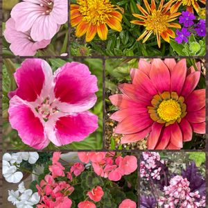 2枚目失礼しますペコリン 庭のお花たち🌸 何時も有難うございます🍀 左上から時計回りに *カスミソウ こぼれ種から *宿根ガザニア オレンジグノメ 花びらは多いですが小さなお花です 昨年名前を教えてくださいました *鮮やかなガザニア *ヒューケラ フォーエバーパープル お花が咲きました *ゼラニウム 2020年秋に種まきから *ゴテチャ(ゴテチヤ) 種まきから第一号開花です 🏷️花咲く乙女たち♡ 🏷️コラージュ仲間達 参加しますペコリン