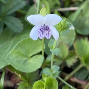 アカフタチツボスミレでしょうか? お花の色は、わずかにムラサキかがっているものの、白色に近いですが。