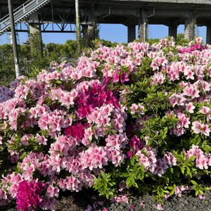 ツツジも満開になりました♪。 後ろに見えるのは新幹線🚄の架橋です。 ♪(๑ᴖ◡ᴖ๑)♪