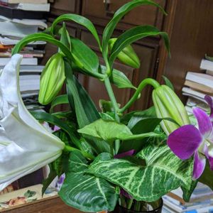 先程と同じく、魚沼産の百合とシンゴニウム、デンファレ。シンゴニウムはバイプレイヤーとしていい仕事してます。