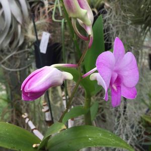 Den. Marble Pink ‘Mai’ 完全開花した花、開花途中の蕾、蕾。その向きに注目して下さい。 重力を感じるのか、蕾から半ひねりして横向きに花を咲かせます。