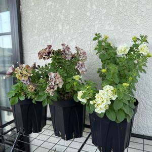 〜今日の庭〜 ベランダの冬越しペチュニア ① いくつかは、大きくなりすぎ花が咲いちゃった💦 ② *栄養素ペチュニア ホーリーノット* ③ *ペチュニアジュリエット モダンホワイト* ④ 🔰良いのか悪いのか? 切り戻しをした。 ⑤ 昨年の姿…。 どれも昨年と色柄が少し違う😅