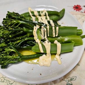 昨日収穫した茎ブロッコリーと、いただいた、圃場菜園のスナップエンドウをいただいて、塩ゆでしてオリーブ油と胡椒をふって朝ごはん。 #茎ブロッコリー #スナップエンドウ