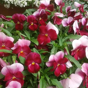 パンジーロゼ、春に成り本来の色に成って来ました。🤍❤️ 中心に1色のお花見えます。 分かりますか? ②アップの花びら、2色に成ったお花良く分かりますか?🤗 ③冬の時の、パンジーロゼのお花です。❤️ ④後ろの、アリッサム、ストック綺麗に咲いています。✨