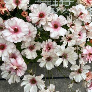 ラナンキュラスラックス アフロディーテ ホワイト系がキレイな子💕 最近の強風続きでお花が垂れてきてしまいました💦 3枚目はお隣のヘラさんと この組み合わせめちゃくちゃかわいい💕