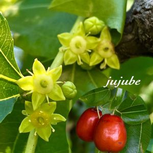 今日のお花*ナツメ 生薬名・大棗(たいそう) 胃腸の調子を整えたり、精神を安定させたりする効果があります… 気血を補いイライラや不眠、疲れやすいといった心身の不調に有効で女性に不足しがちな鉄分や葉酸も豊富に含まれています👏💯 今年の出会い💖から・:*+. 《スライドpic》 ①~④ 6月初旬に咲いたお花💛💚が 10月には真っ赤な実🔴に変身!