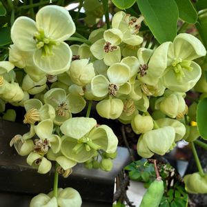 今日のお花*アケビ 4月に入ってすぐに開花🤍 白花アケビ、可愛い~😍🫶 《スライドpic》 ① ~③ いろんな角度から🤳✨ 初めて見た若い実も一緒に… ④昨日、若い実💚を見たのは初めてです🥳🎵〰️