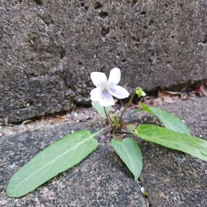 ヒメスミレ② アスファルトの隙間に咲いていました 花が小さくて でも距は太め 葉はとても長いです 葉裏は紫がかっていました 残念ながら花の正面から撮れませんでした ヒメスミレではないかと思いますが 合ってますか? ヒメスミレと教えていただきました