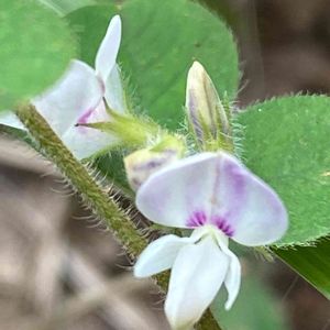 ネコハギ、マメ科 少し秋らしくなったので、ゆっくり山のぼり再開。茎は地面をはって、白い旗弁に紫のまだらがありました😌